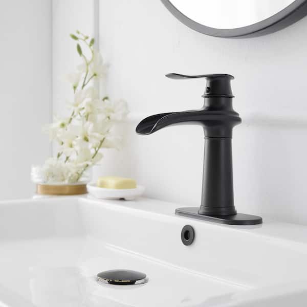 Waterfall Single Hole Single Handle Bathroom Vanity Sink Faucet Farmhouse With Pop up Drain Assembly in Matte Black