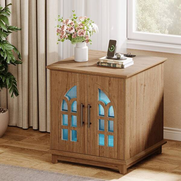 23.6 in. Brown Nightstand with Charging Station and RGB Light, Farmhouse Night Stand Square Bedside Table (Set of 2)