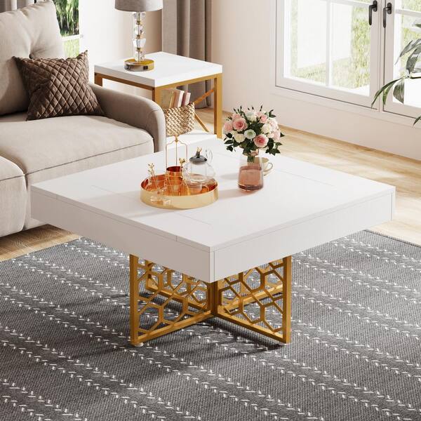 Allan 35.4 in. White and Gold Square Engineered Wood Coffee Table Modern Tea Table with Metal Frame
