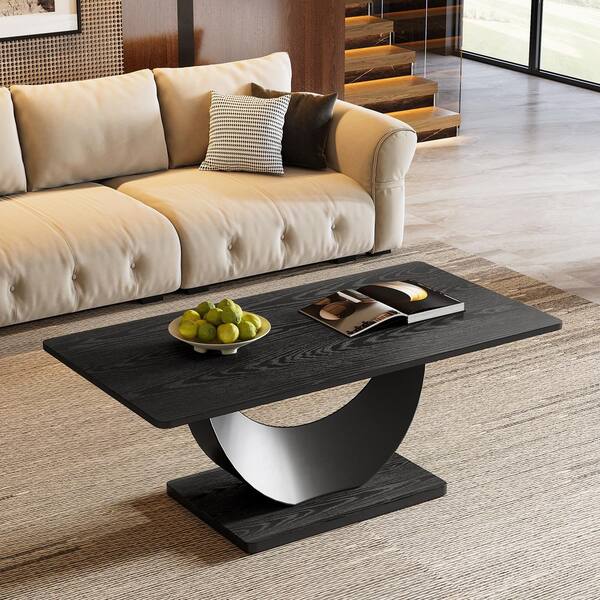 Allan 47.2 in. Black Rectangle Wood Coffee Table with Crescent Moon Metal Base, Coffee Table Tea Table for Living Room