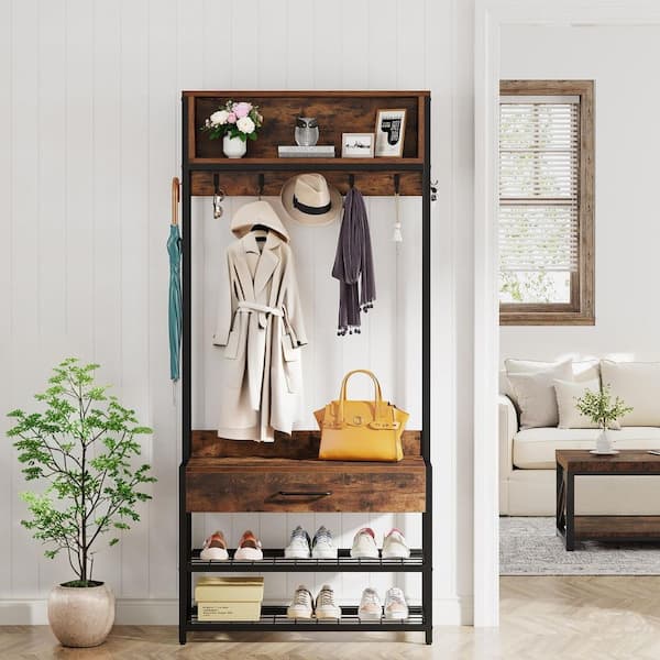 Brown 70 in. H Wood Coat Rack with Shoe Hutch, Vintage Industrial Accent Freestanding with Metal Frame Entryway Home