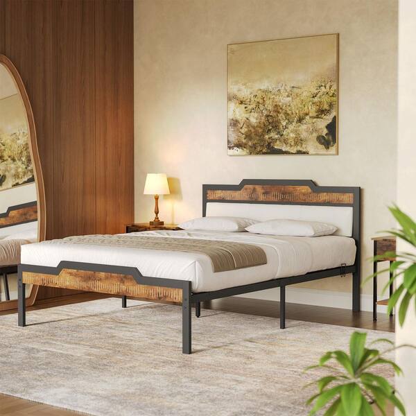 Brown and Black Wood Frame Queen Size Platform Bed with Headboard and Footboard