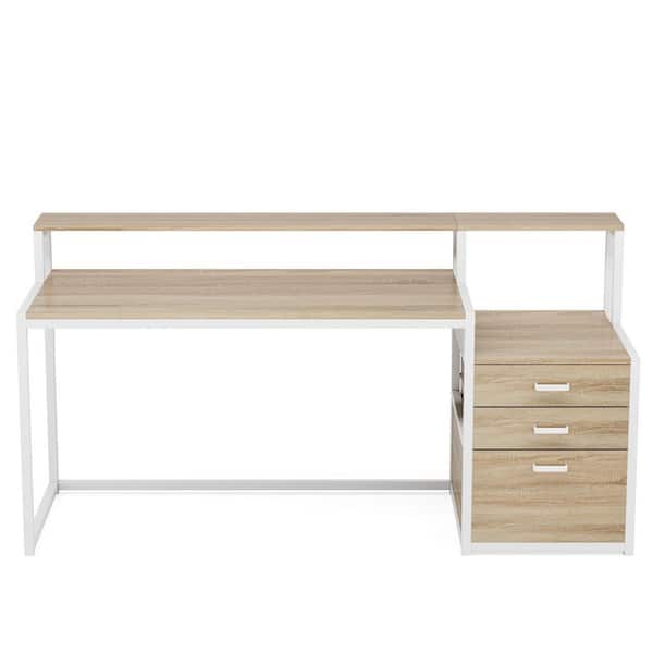 Capen 63 in. Rectangle Natural White Engineered Wood Computer Desk Office Table Workstation 3-Drawer/Monitor Stand/Hutch