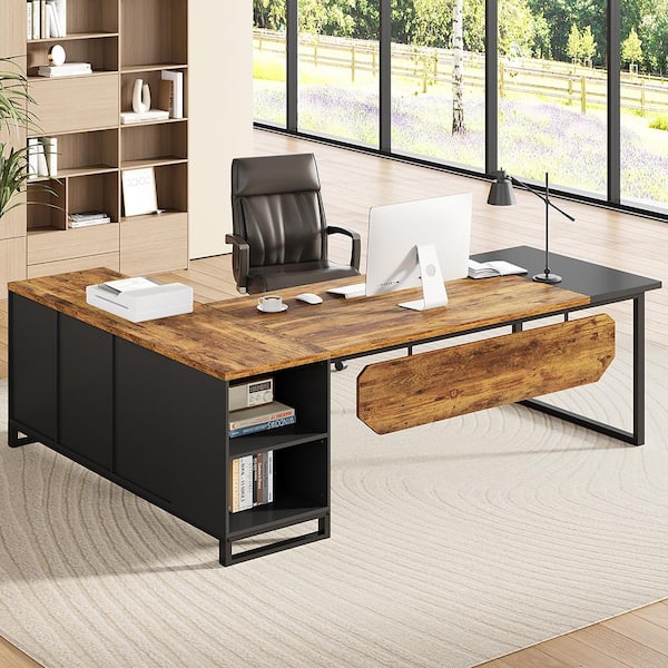 Capen 70.8 in. Brown and Black Wood L Shaped Executive Desk with Storage Shelves and Cabinet for Home Office