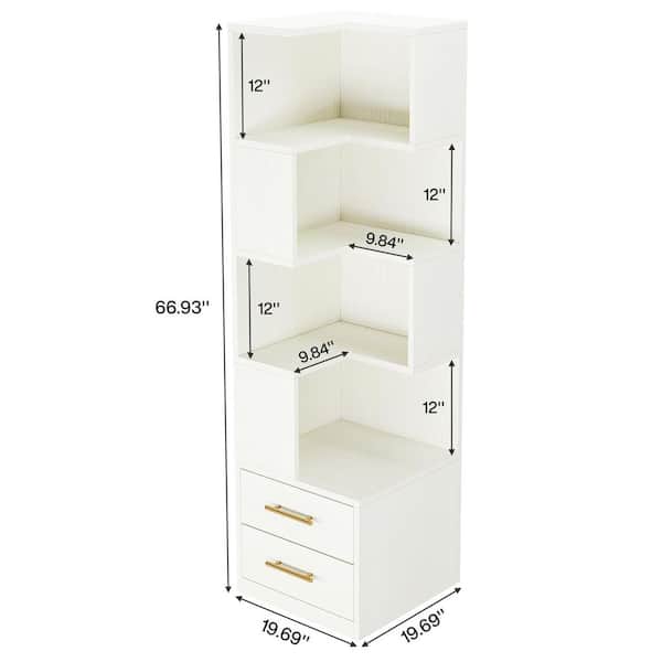 Eulas 66.9 in. Tall White Engineered Wood 4-Shelf Modern Standard Bookcase Corner Bookshelf with 2 Drawers