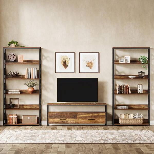 Eulas 70.87 in. Tall Brown Black Wood 6-Shelf Etagere Bookcase with Distinctive X-Shaped Panels Wooden Backrail