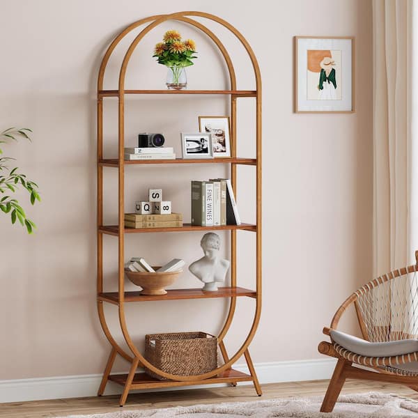 Eulas 70.9 in. Tall Brown Wood 5-Shelf Etagere Bookcase with Metal Frame, Open Bookshelf Arched Bookcase
