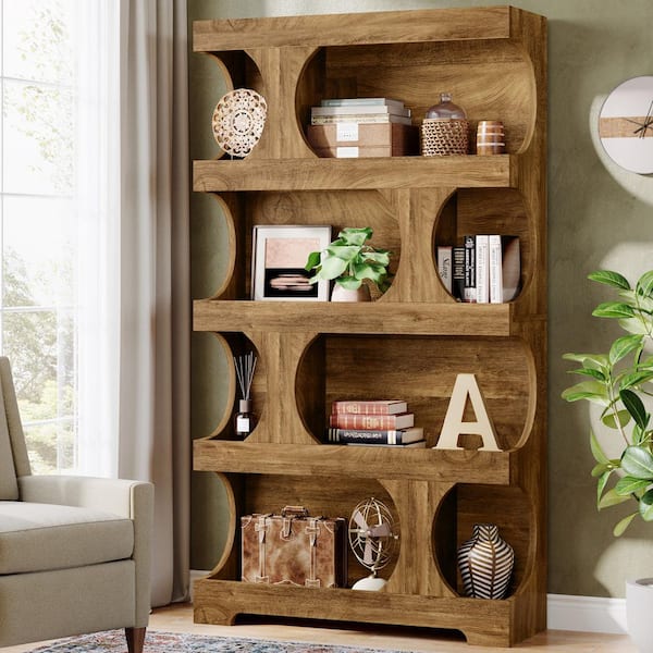 Eulas 71.3 in. Tall Brown Wood 4-Shelf Standard Bookcase / Unique Shape, Modern Freestanding Display Shelf