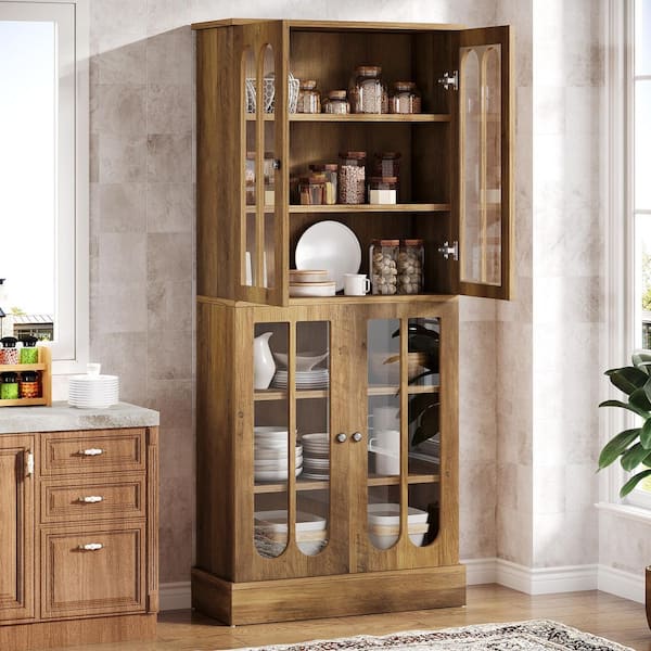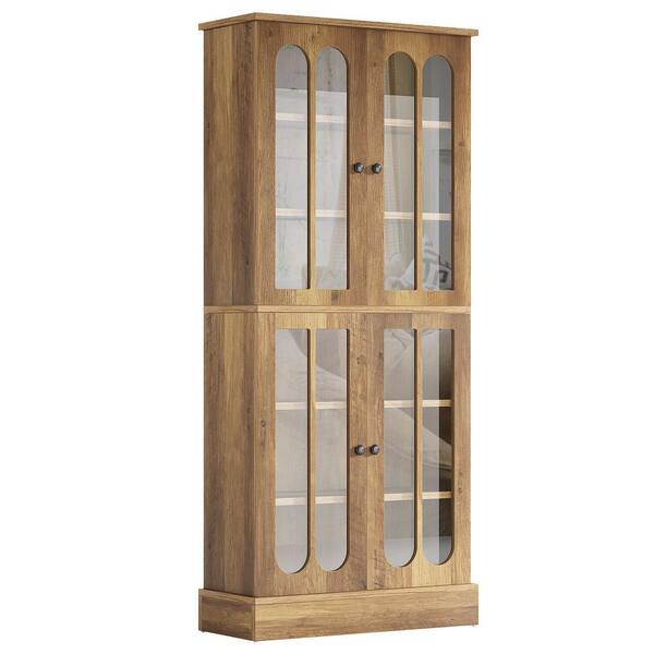 Keenyah Brown Wood 31.5 in. Kitchen Pantry Cabinet with Arched Translucent Doors and 6-Tier Spacious Shelves