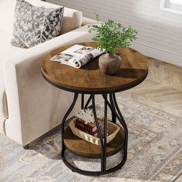 Kerlin 19.7 in. Brown Rustic Round Wood Side Table 2-Tier End Table with Metal Frame for Living Room, Bedroom