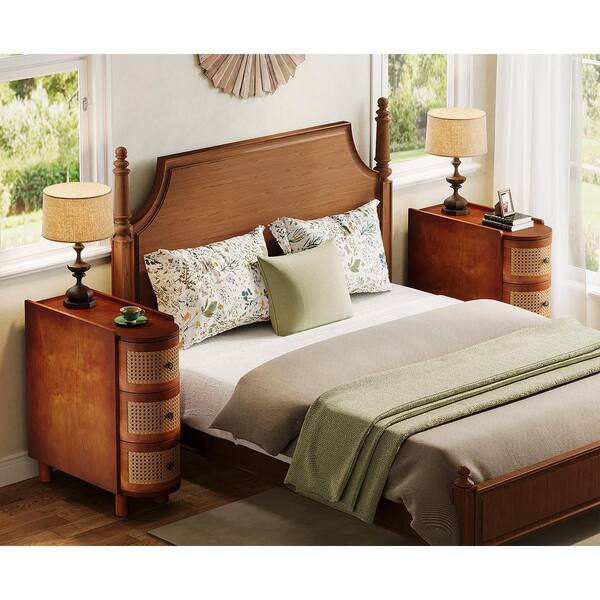 Kerlin 2-Pieces 23.62 in. Walnut Oak U-Shaped Solid Wood Side Table Cabinet Nightstand with Rattan 3-Drawer (Installed)