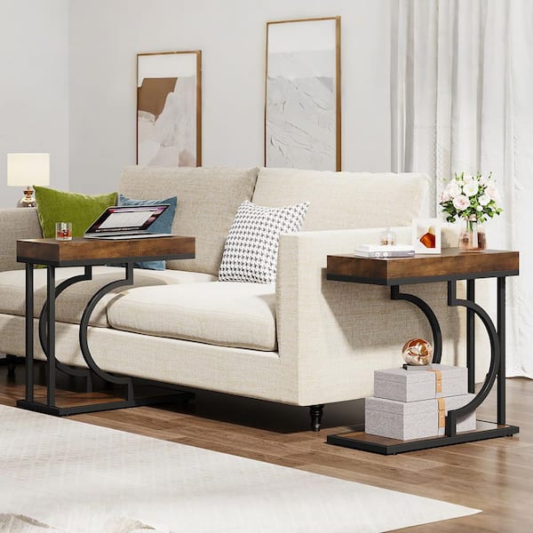 Kerlin 23.6 in. Brown and Black C Shaped Wood Narrow End Table, 2-Tier Side Table with Metal Frame for Living Room, 2pcs