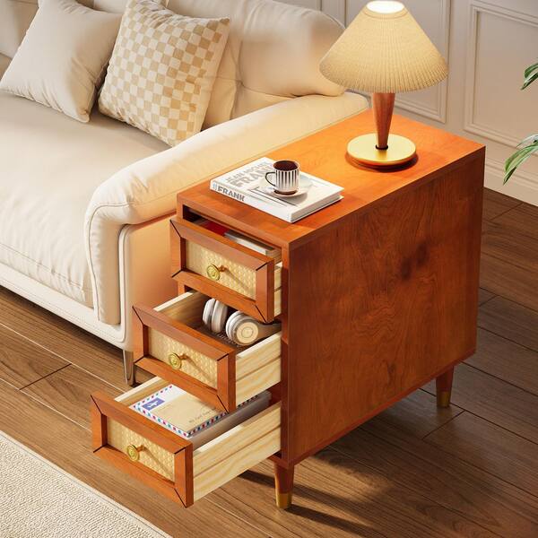 Kerlin 23. 62 in. Walunut Wood Rectangle All Solid Wood Side Table with 3-Drawers, Vintage End Table with Storage