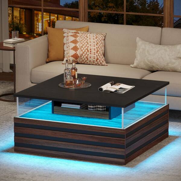 Kerlin 31.5 in. Brown and Black Square Engineered Wood Coffee Table with LED Light and Drawers
