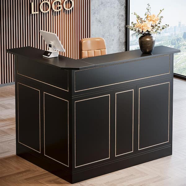 Lanita 51.2 in. L-Shaped Black Wood Reception Desk with Storage Shelves, Modern Front Desk Reception Counter Table
