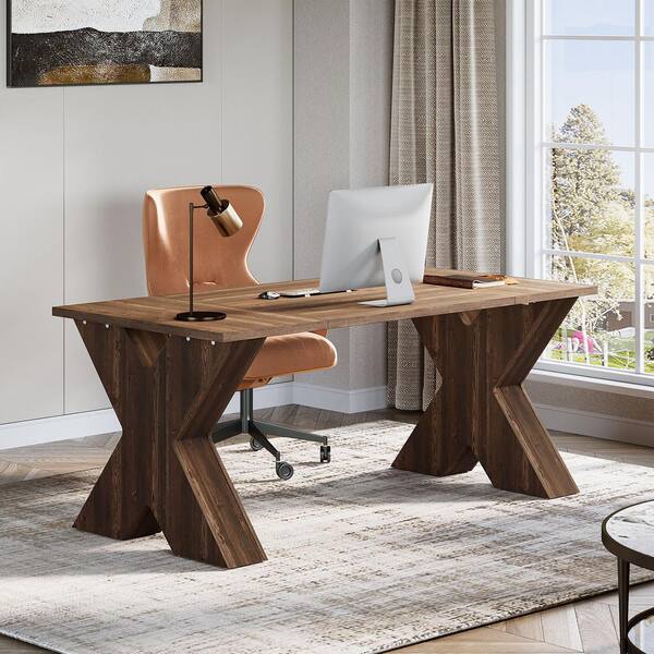 Lanita 63 in. Rectangular Brown Engineered Wood Computer Desk with X-Shaped Thickend Wood Pedestal Base