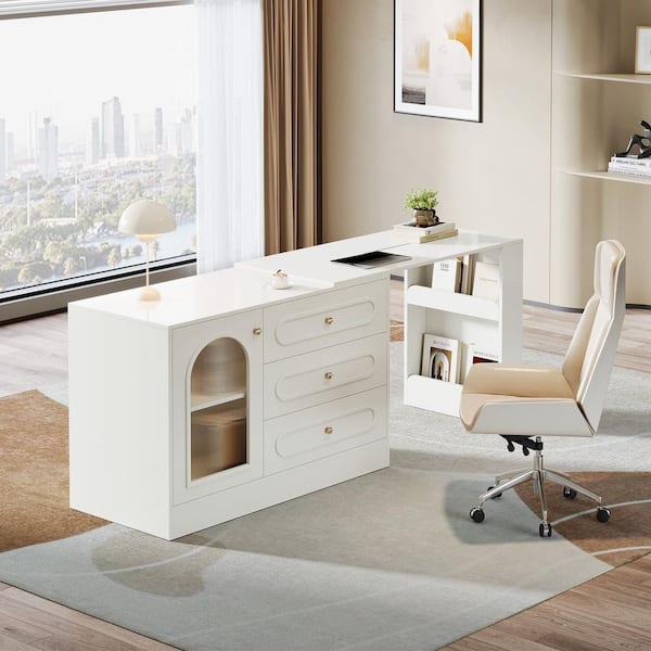 Moronia 39.37 in. 360° Rotatable Extendable White Computer Desk with 3 Drawers, Cabinet and Side Storage Shelves