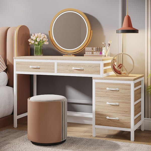 Moronia 51 in. Retangular Brown White Computer Desk 5-Storage Drawers Home Office Study Writing Table Reversible Cabinet