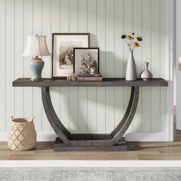 Turrella 63 in. Gray Rectangle Wood Console Table, Narrow Long Foyer Sofa Table with Geometric Metal Base for Hallway