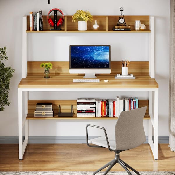 Witham 47.2 in. Rectangular Walnut and White Engineered Wood Computer Desk with Hutch and Shelf
