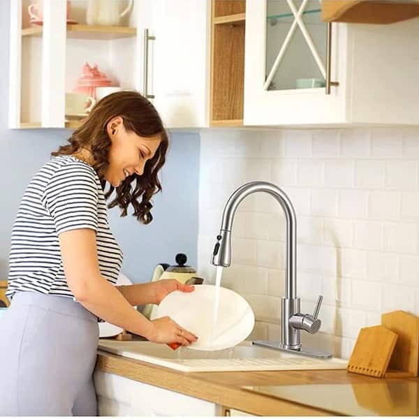 15.35 in. Single Handle Pull Down Sprayer Kitchen Faucet Commercial Sink 360° Swivel Spout for RV, Laundry in Nickel