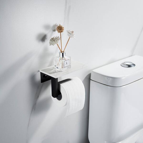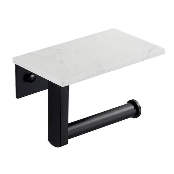 Wall Mount Toilet Paper Holder Bath Hardware Accessory with Natural Marble Shelf Tissue Storage Holder in Matte Black