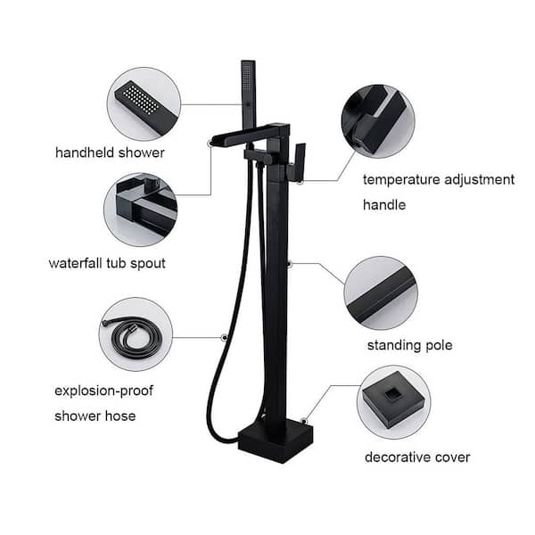Waterfall Single-Handle Freestanding Tub Faucet Floor Mount Filler with Square Hand Held Shower Modern in Matte Black
