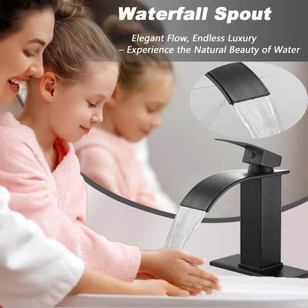 Waterfall Single Handle Single Hole Low-Arc Bathroom Faucet Drip-Free Vanity Sink Faucet with Deck Plate in Matte Black