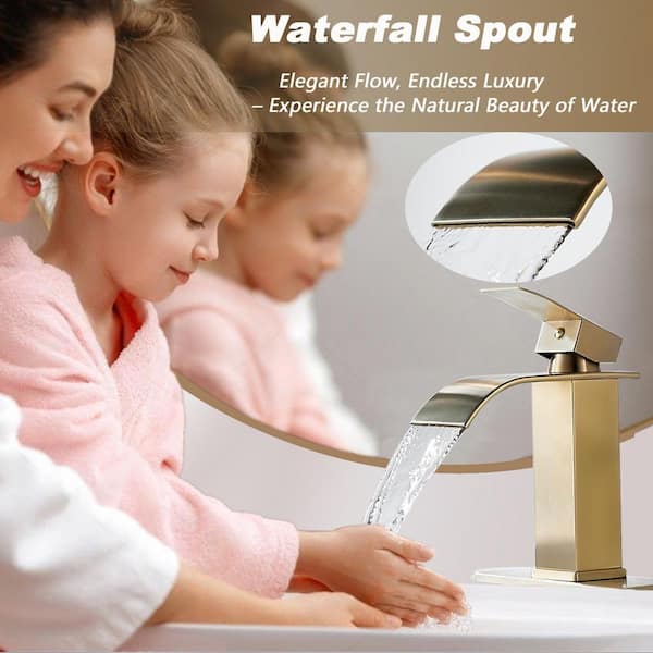 Waterfall Single Handle Single Hole Low-Arc Bathroom Faucet Drip-Free Vanity Sink Faucet with Drain Kit in Brushed Gold