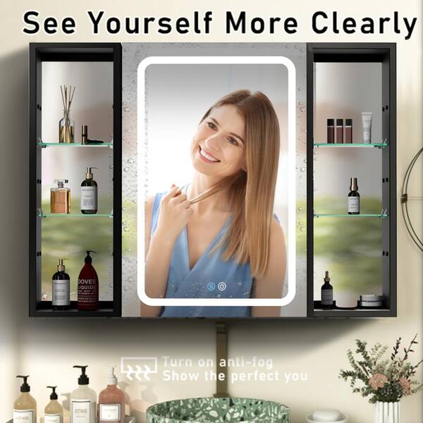 Bail 40 in. W x 30 in. H Medium Rectangular Silver Aluminum Glass Surface Mount Medicine Cabinet with Mirror Right Swing