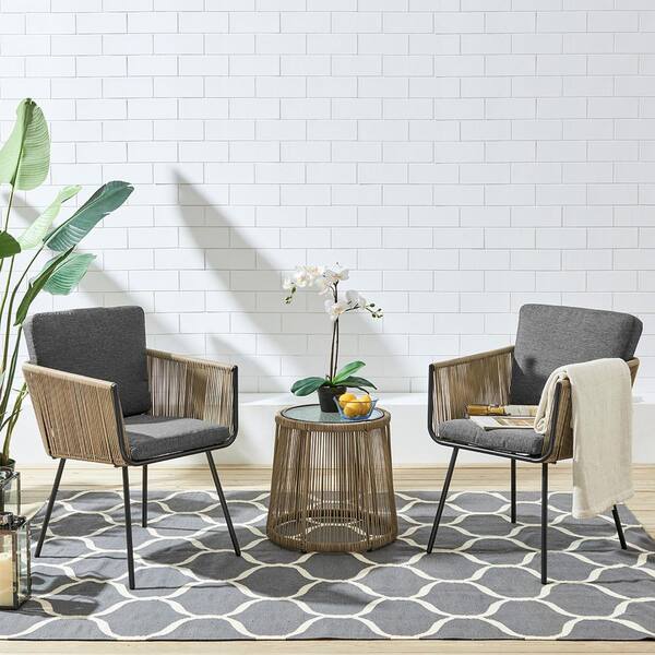 3-Piece Rattan Wicker Outdoor Patio Furniture Set with Gray Cushioned Armrest Chairs and Coffee Table