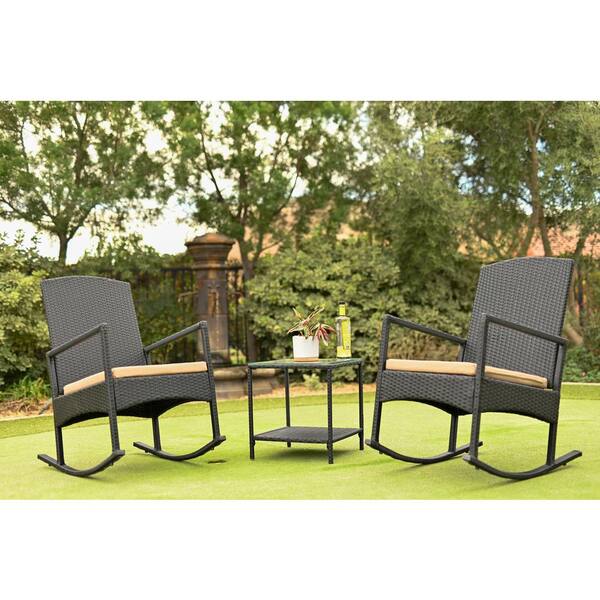 3-Pieces Black Arm Chair Outdoor Patio Rattan Wicker High-Back Rocker Cushioned Chair Set w/Table