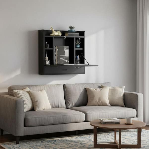 6.75 in. Rectangular Black Wood One Drawer Laptop Writing Computer or Makeup Desk Wall Mount Folding