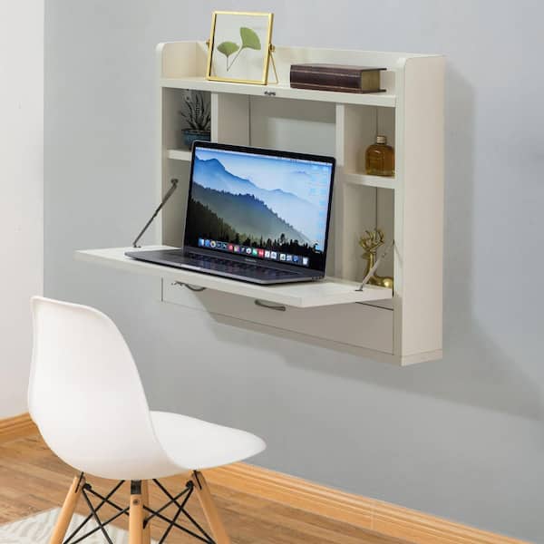 6.75 in. Rectangular White Wood 1-Drawer Laptop Desk With Wall Mount Folding Features