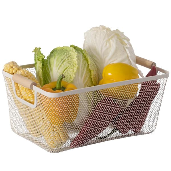 White Metal Mesh Cube Storage Bin Basket with Wooden Handle, Large, 6.5 in. H x 14.5 in. W x 8.5 in. D