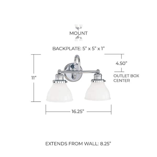 Baxter 16 in. W x 11 in. H x 8 in. E 2-Light Chrome Vanity Light with Milk Glass