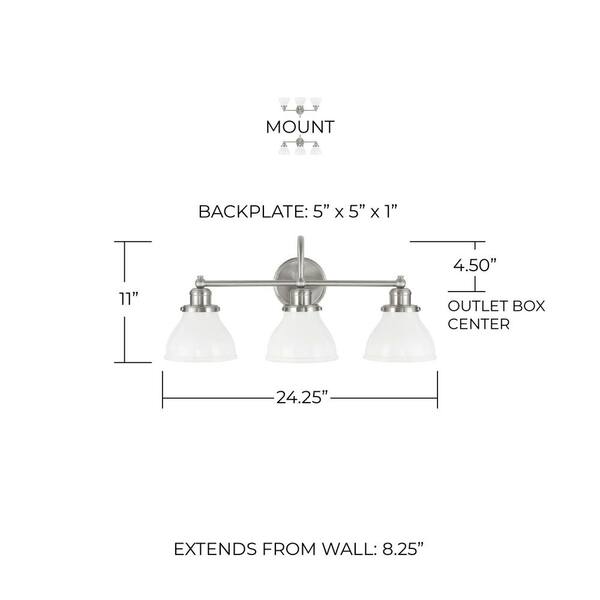 Baxter 24 in. W x 11 in. H x 8 in. E 3-Light Brushed Nickel Vanity Light with Milk Glass