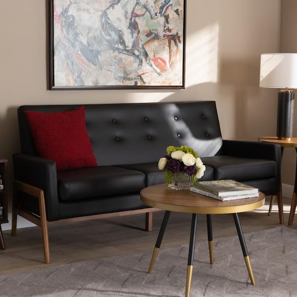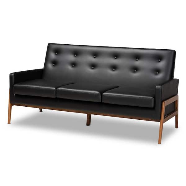 Perris 68.5 in. Black/Walnut Faux Leather 3-Seater Cabriole Sofa with Square Arms