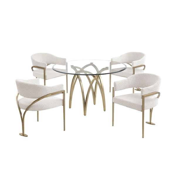 Bayton 5-Piece Clear Tempered Glass Top Brushed Matte Gold Chrome-Plated Base Dining Set With 4-Cream Color Chairs