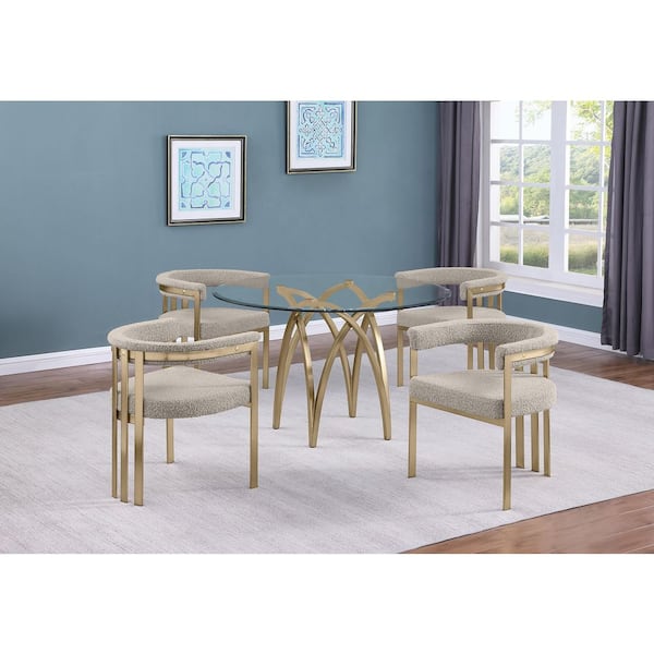 Bayton 5-Piece Clear Tempered Glass Top Brushed Matte Gold Chrome-Plated Base Dining Set With 4 Grey Boucle Chairs