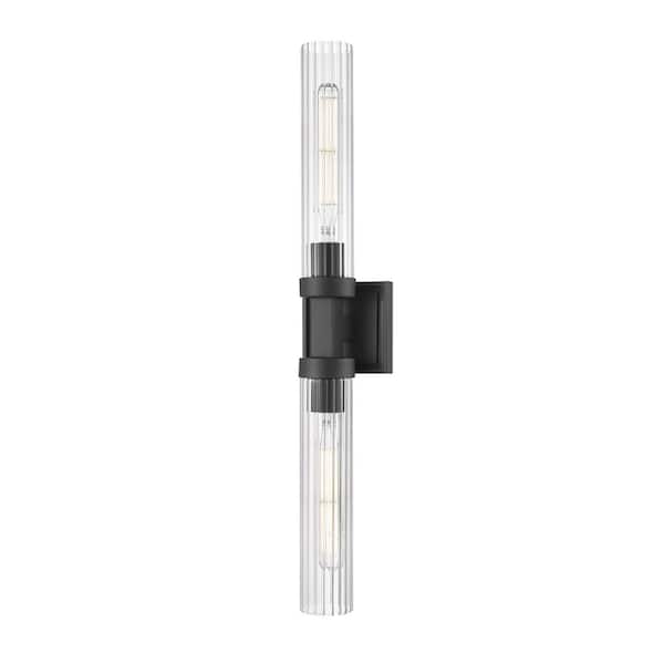 Beau 27 in. Matte Black 2 Light Wall Sconce with Clear Ribbed Glass Shade