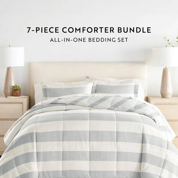 7-Piece Distressed Stripe Light Blue Pattern Comforter Queen Microfiber Bedding Bundle