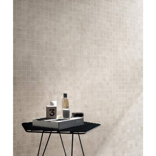 • Geometric matte porcelain mosaic tile with a concrete look