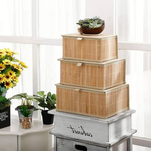 Beige 13 in. x 6.1 in. Bamboo Decorative Basket Set of 3 with Lid