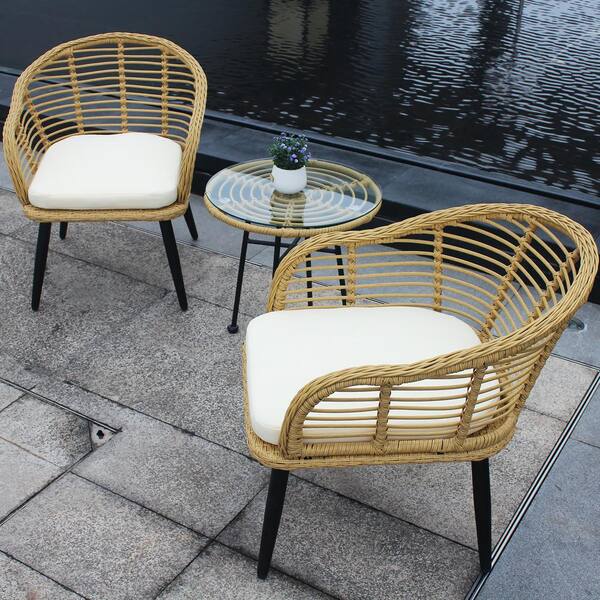 Beige 3-Piece Wicker Outdoor Bistro Table Set with Beige Cushion