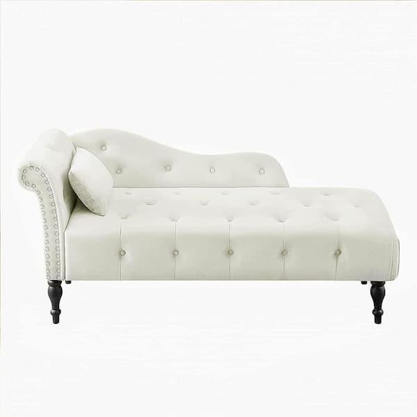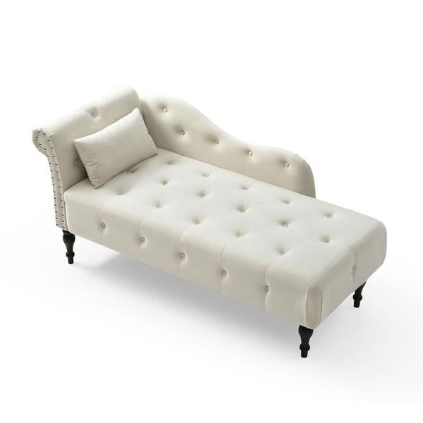 Beige Buttons Tufted Nailhead Trimmed Velvet Chaise Lounge with 1-Pillow