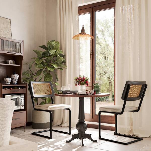 Beige Metal Outdoor Bar Stool Dining Chair, Upholstered Rattan Dining Chair with Cane Backrest Metal Base(2-Pack)