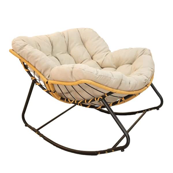 Beige Metal Outdoor Rocking Chair, Patio Egg Rocking Chair, Modern Cozy Lounge Rocker Chair with Cushion
