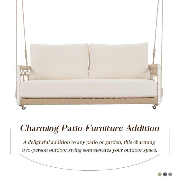Beige Wicker Porch Swing Woven Rope Outdoor Swing Sofa with Cushions Seating 2 for Patio, Courtyard and Balcony