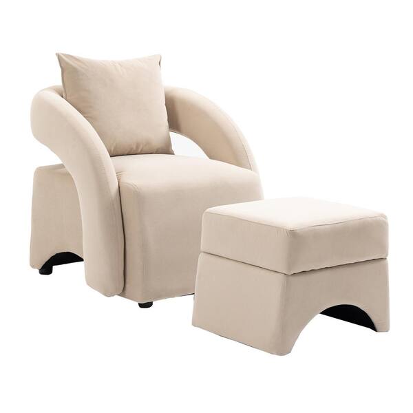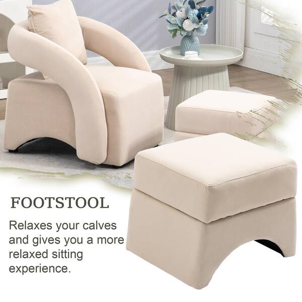 Beige Wood Outdoor Lounge Chairs with Ottoman, Upholstered Club Tub Round Arms Chair for Living Room